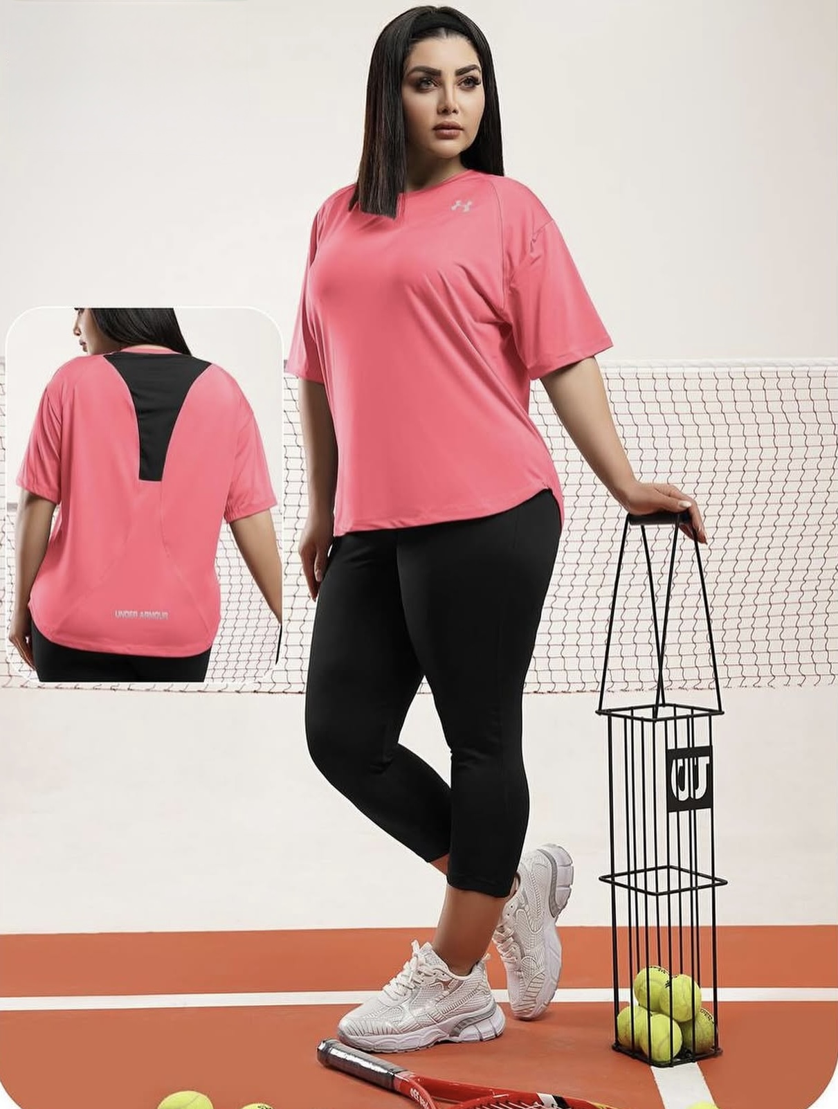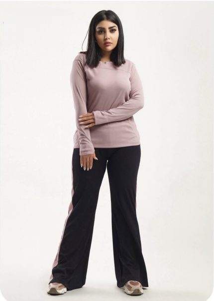 این ست از یک بلوز آستین کوتاه صورتی با یقه گرد و لگ مشکی تا زیر زانو تشکیل شده است.