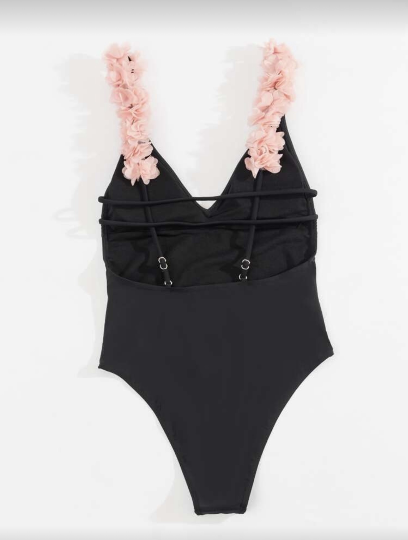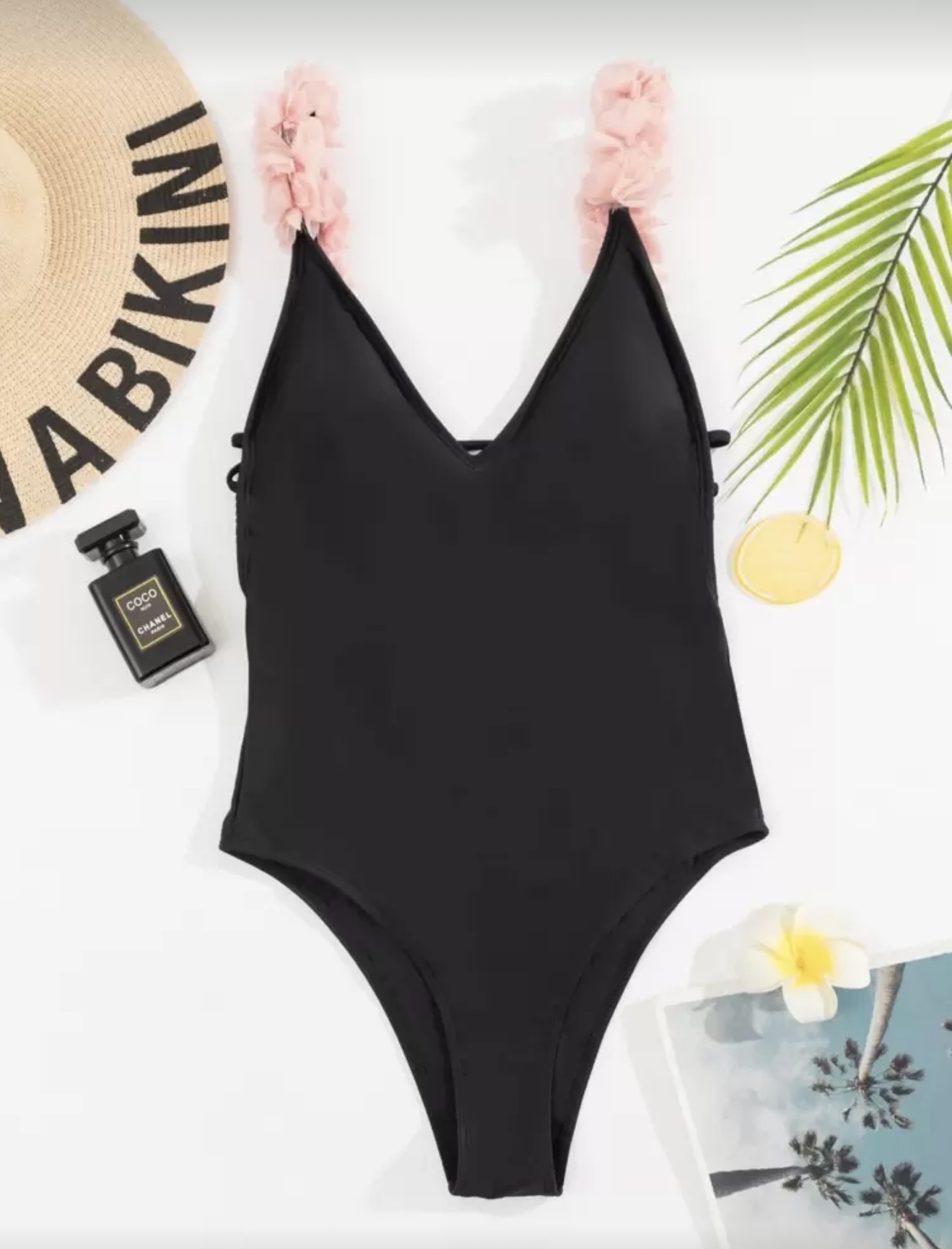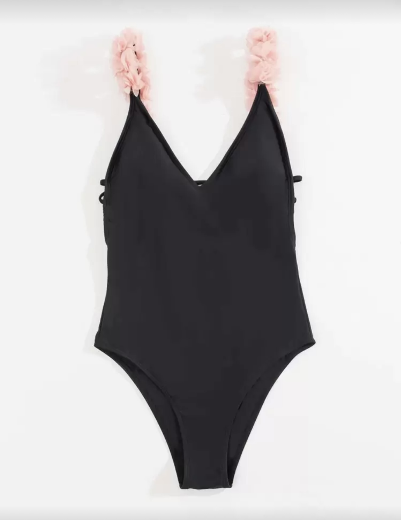مایو یک تکه مشکی با بند شکوفه گیلاس صورتی