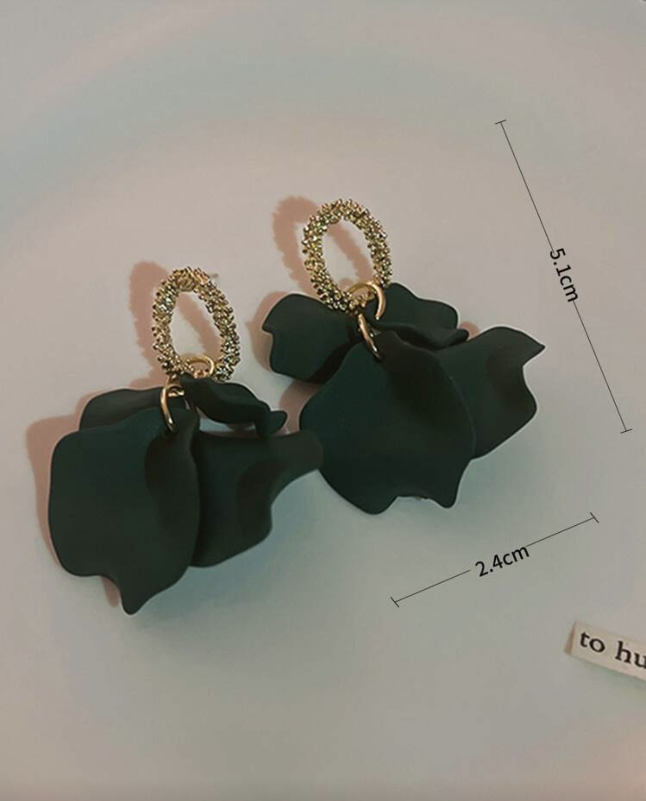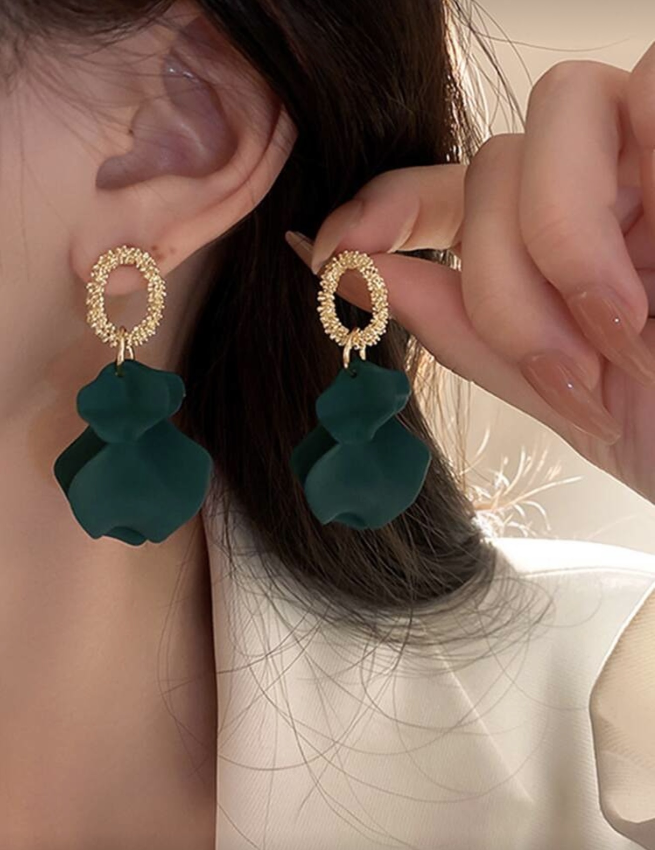 گوشواره مجلسی آویز گلبرگی سبز با منگوله طلایی
